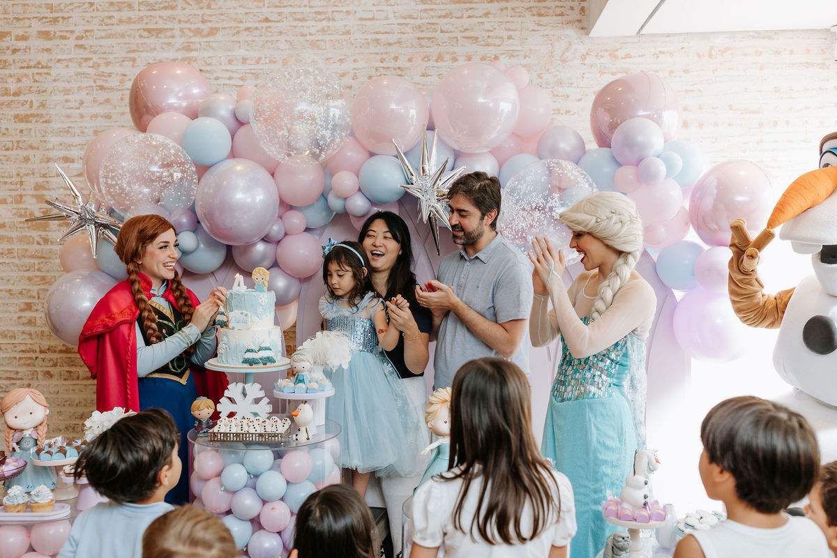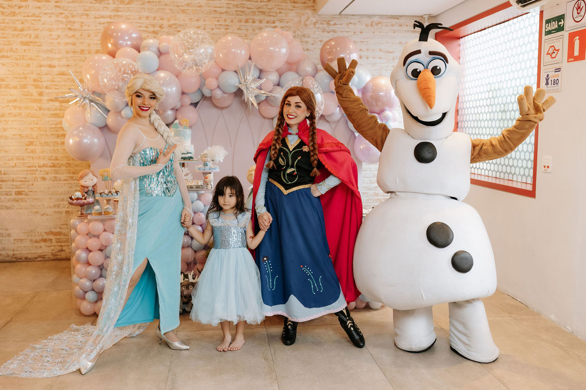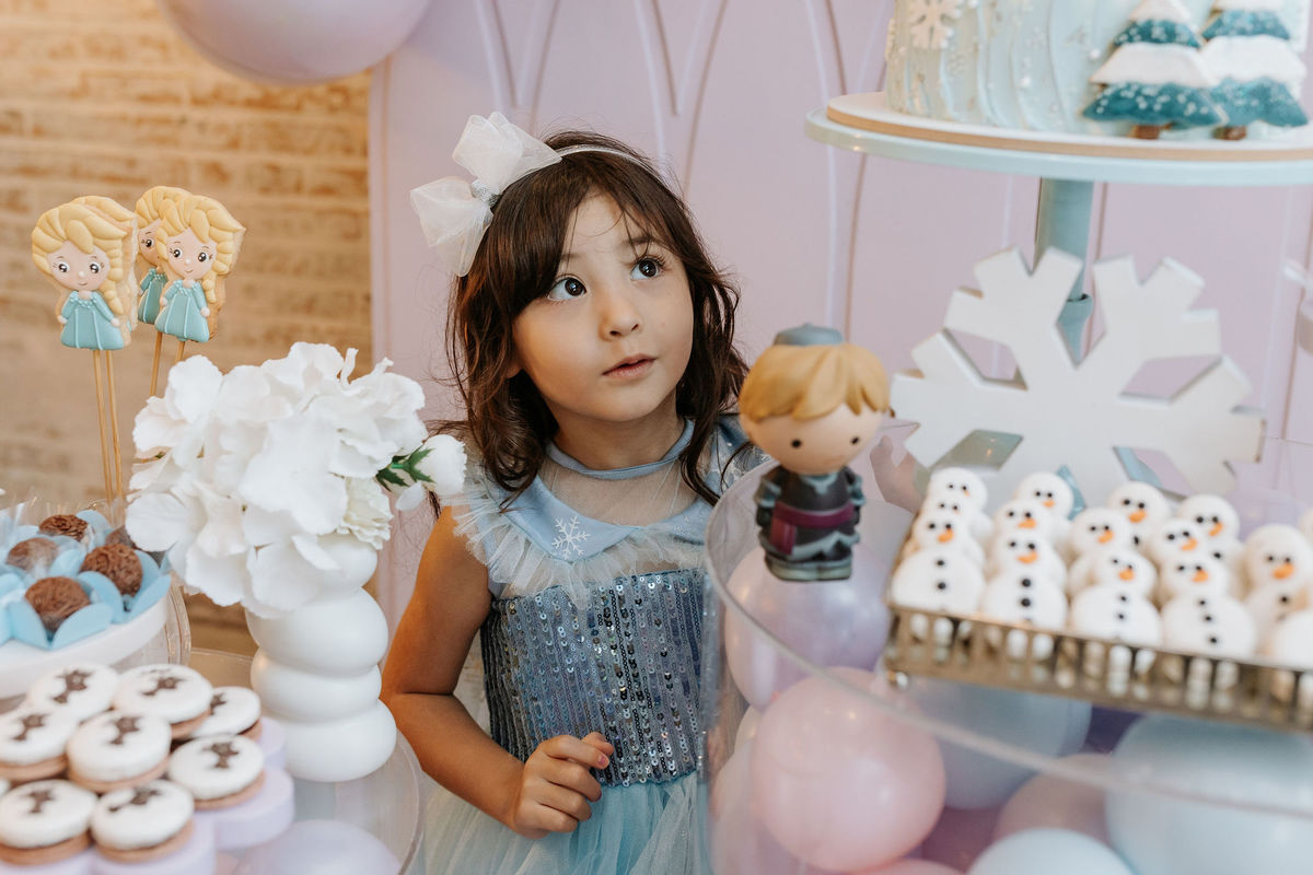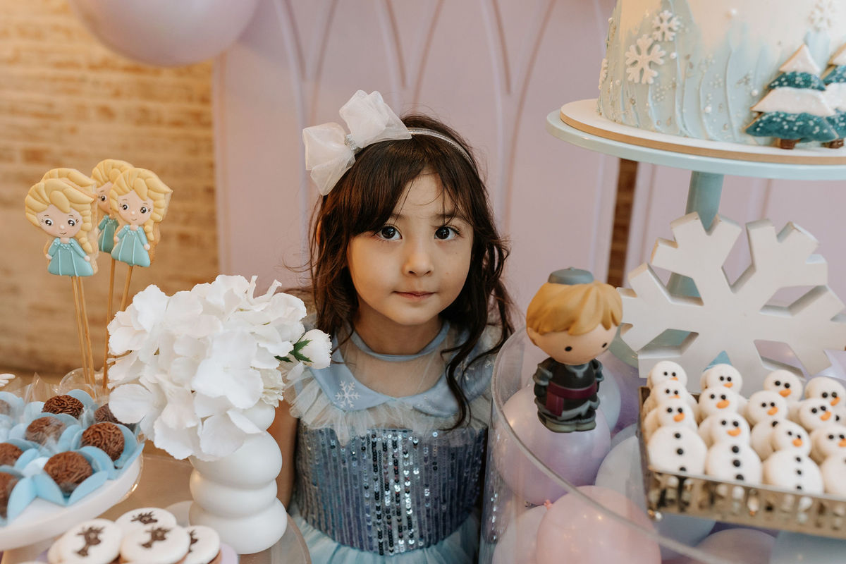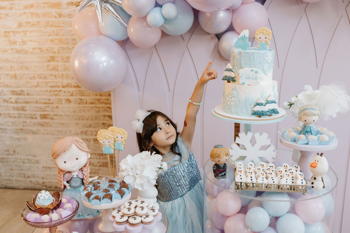 O tema era Frozen, e a mãe da Olivia fez questão de colocar a própria alma nessa festa. Com o apoio da equipe do Mi Casa, ela criou uma decoração que misturava o universo de Frozen com toques personalizados, aquele tipo de detalhe que só aparece quando quem decora conhece a criança de verdade.