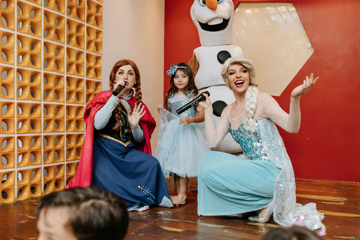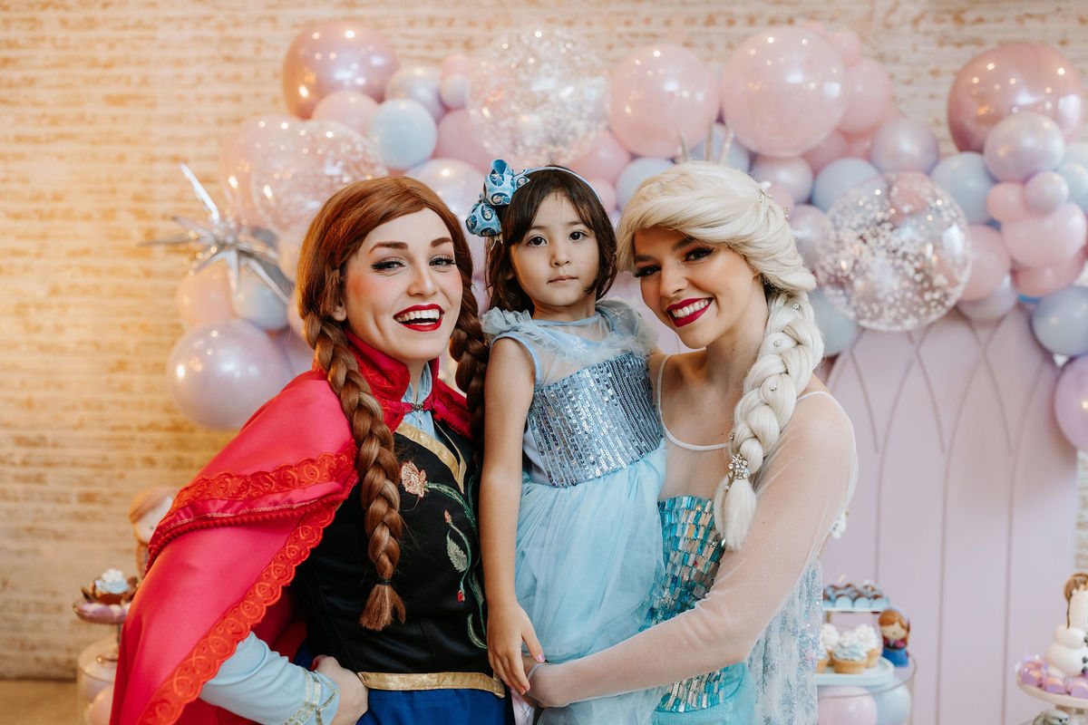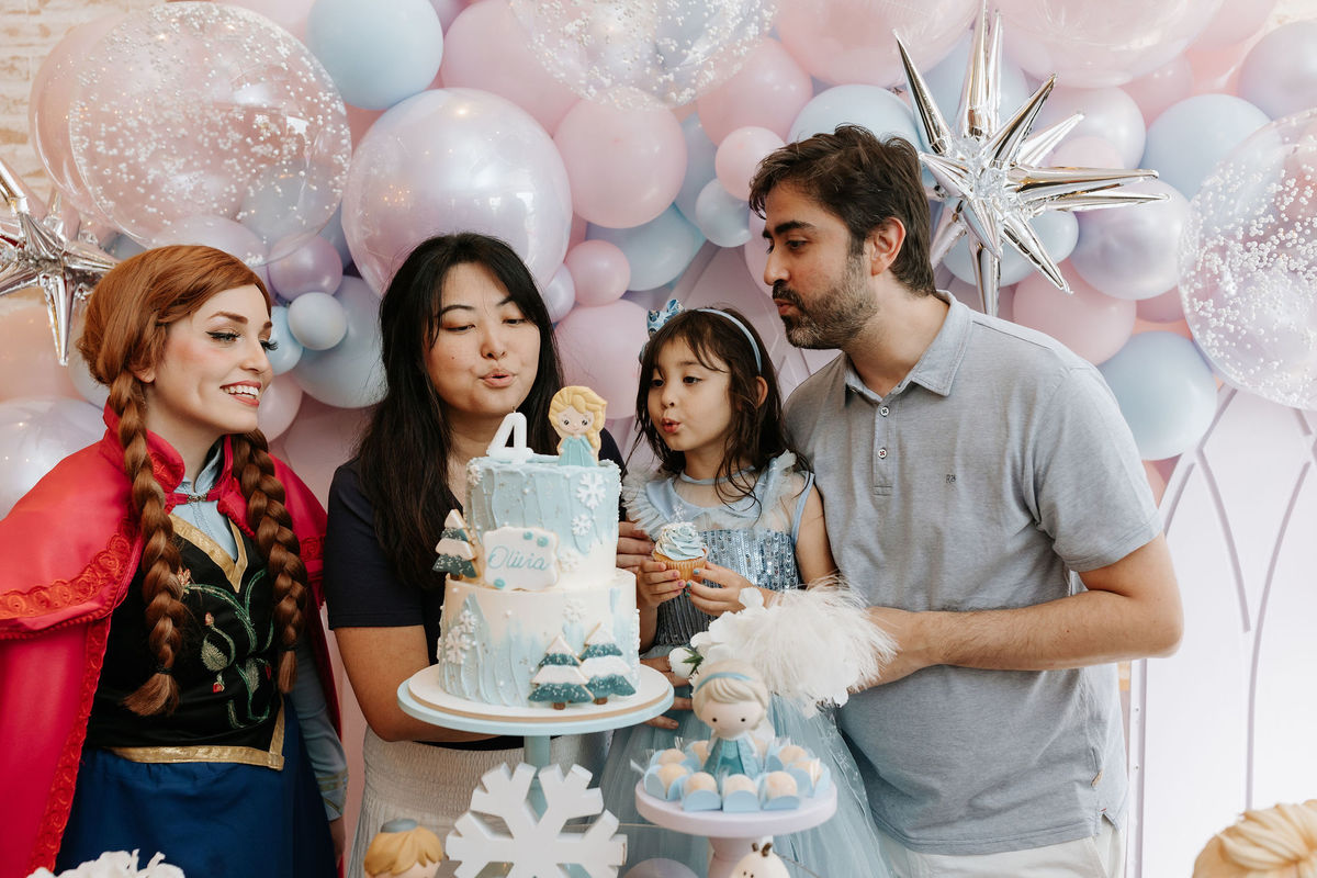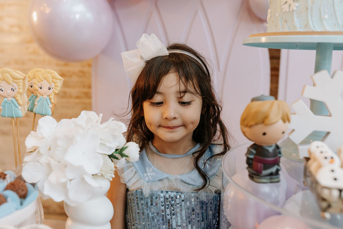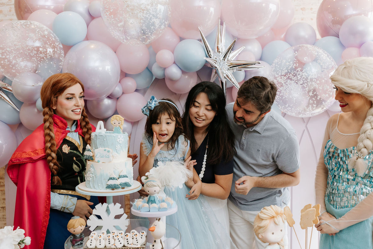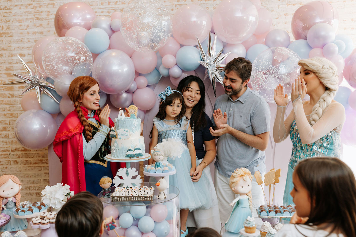 O tema era Frozen, e a mãe da Olivia fez questão de colocar a própria alma nessa festa. Com o apoio da equipe do Mi Casa, ela criou uma decoração que misturava o universo de Frozen com toques personalizados, aquele tipo de detalhe que só aparece quando quem decora conhece a criança de verdade.