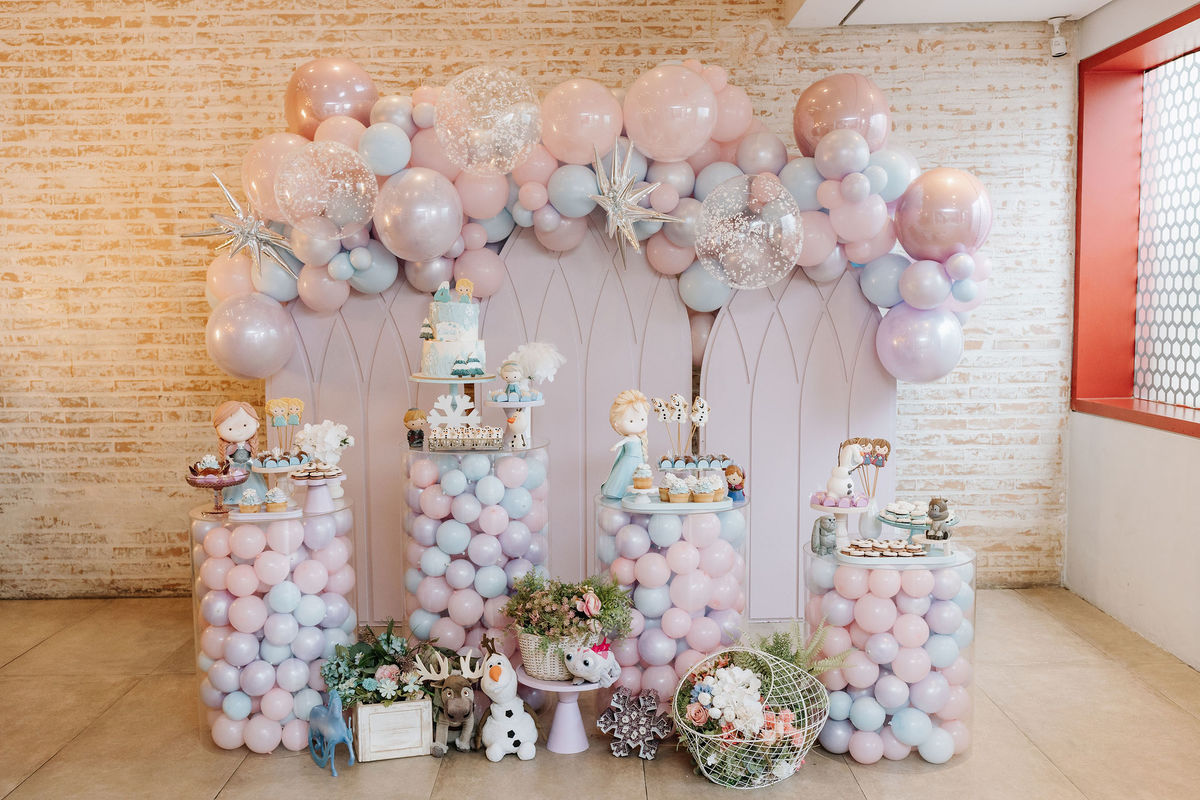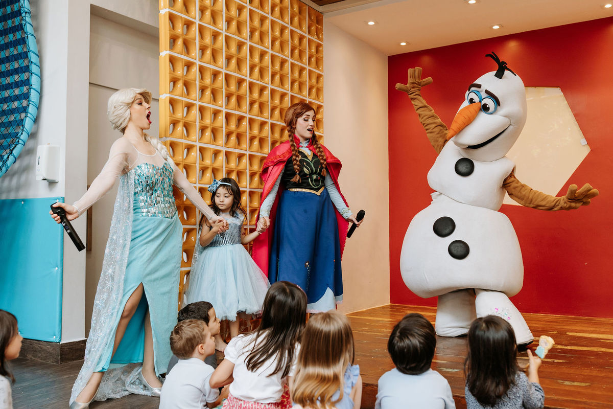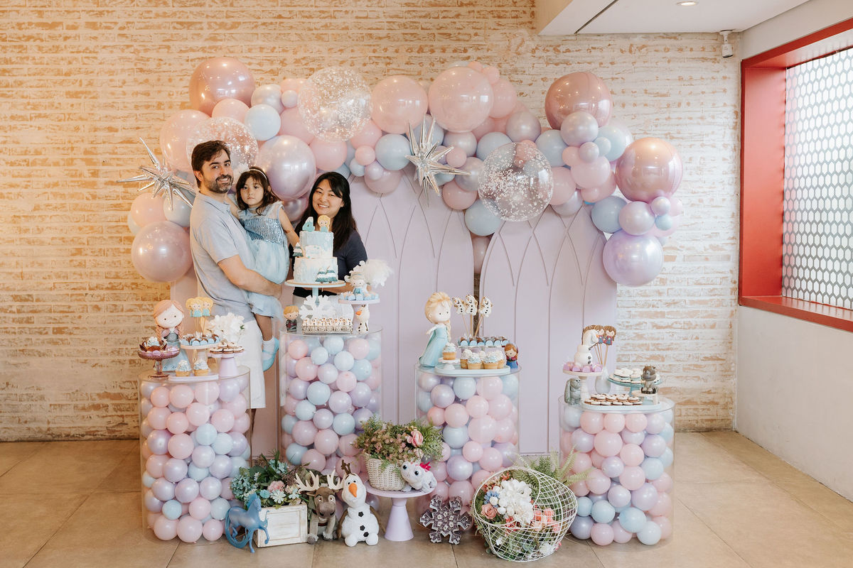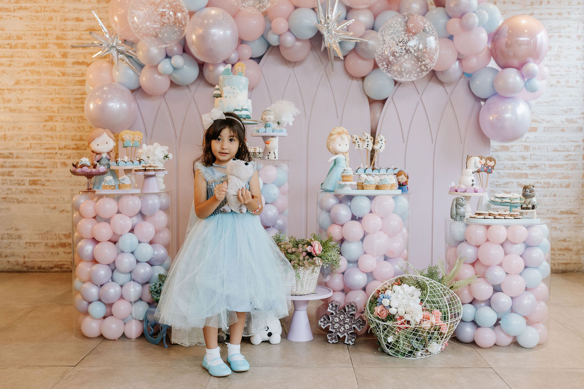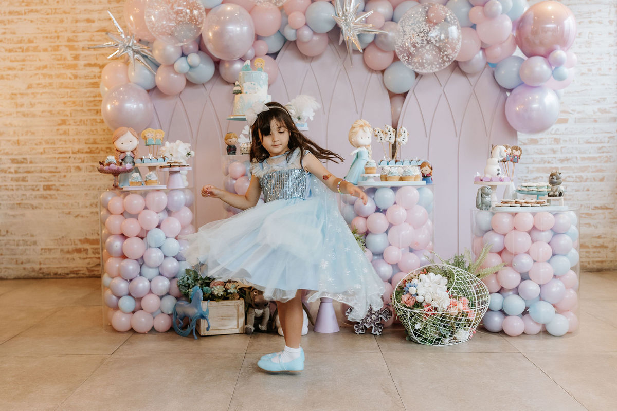 O tema era Frozen, e a mãe da Olivia fez questão de colocar a própria alma nessa festa. Com o apoio da equipe do Mi Casa, ela criou uma decoração que misturava o universo de Frozen com toques personalizados, aquele tipo de detalhe que só aparece quando quem decora conhece a criança de verdade.