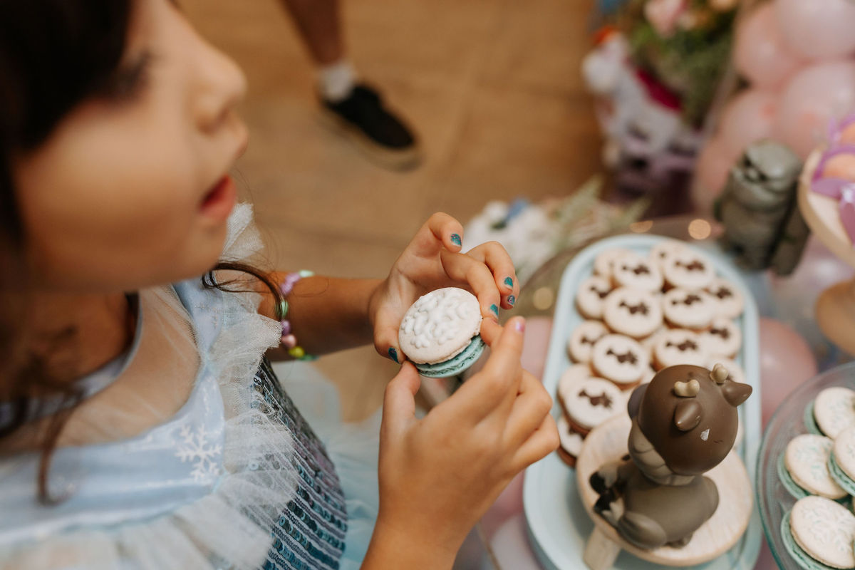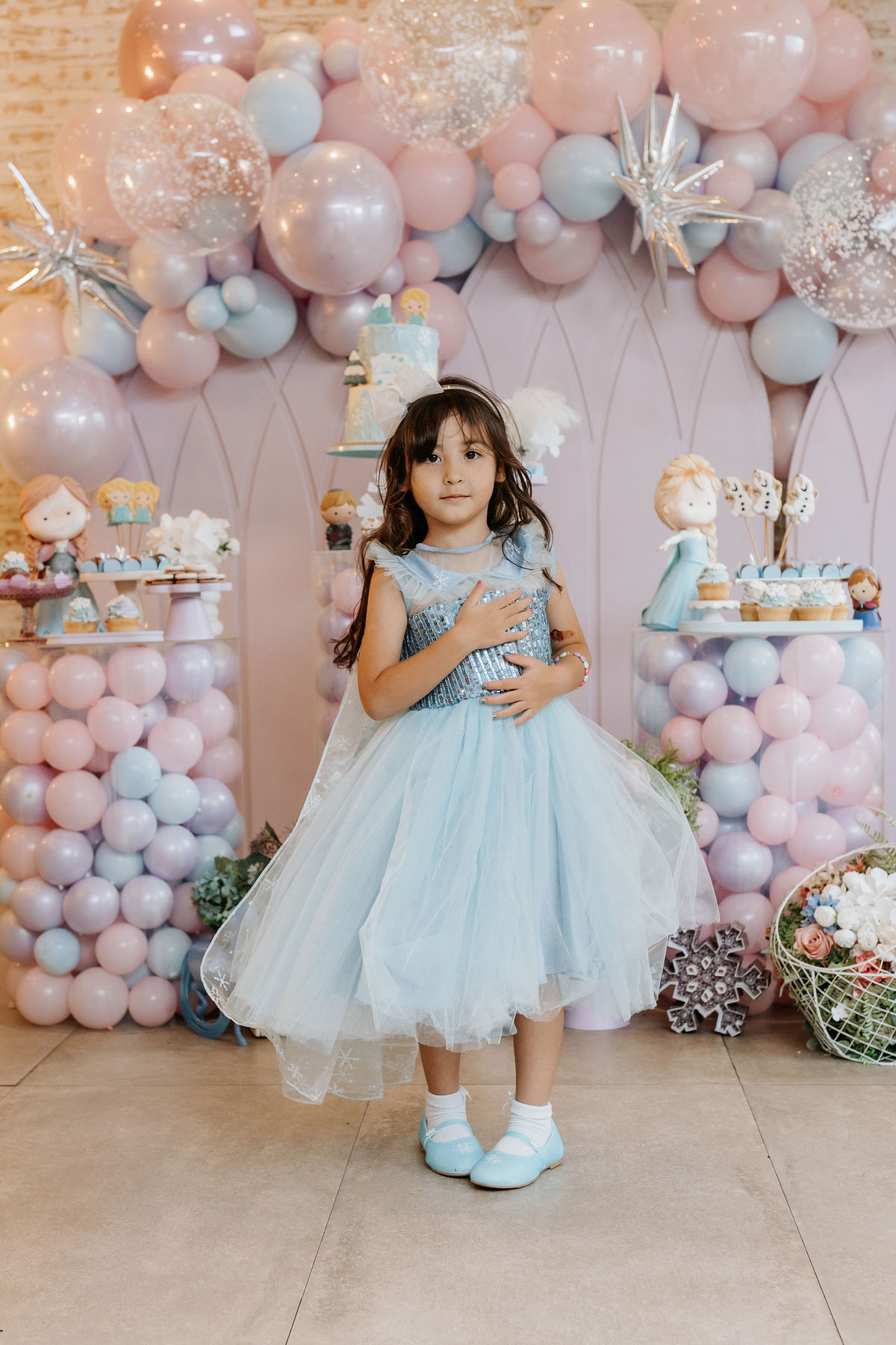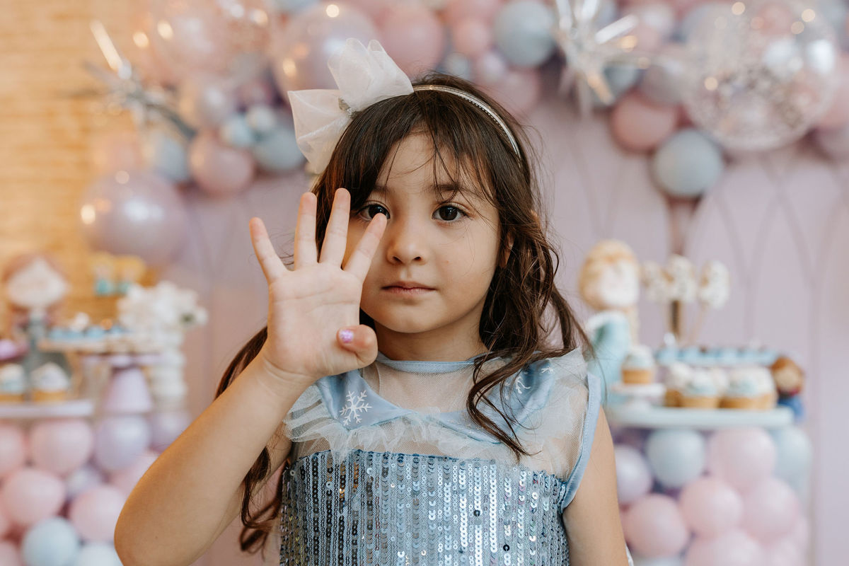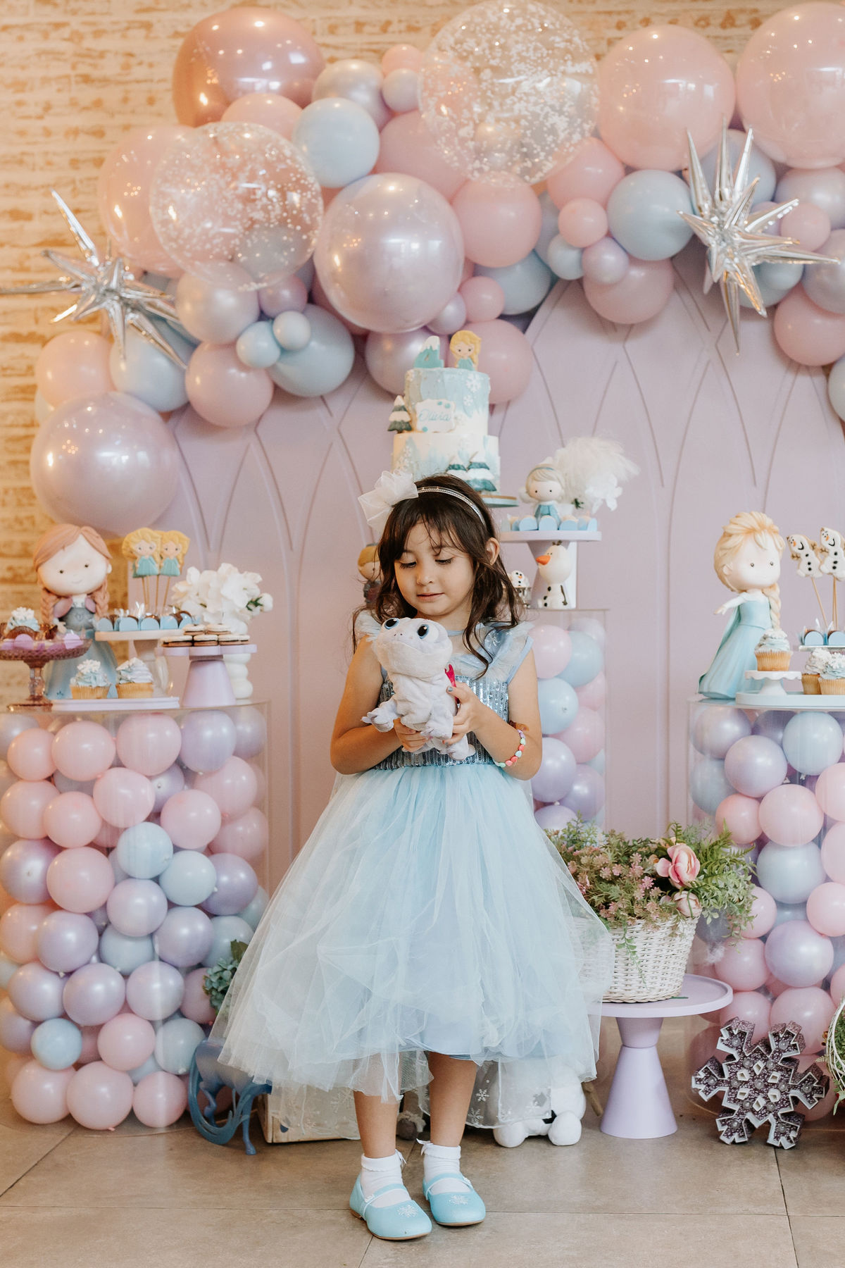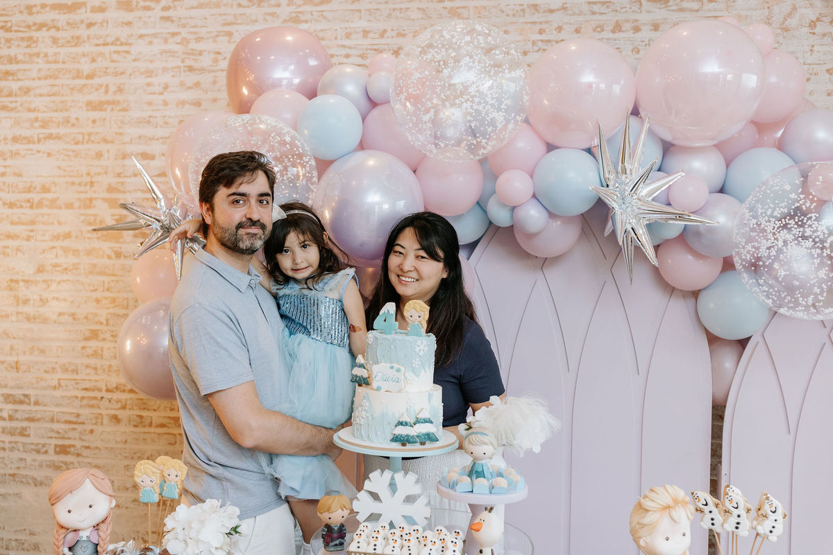 O tema era Frozen, e a mãe da Olivia fez questão de colocar a própria alma nessa festa. Com o apoio da equipe do Mi Casa, ela criou uma decoração que misturava o universo de Frozen com toques personalizados, aquele tipo de detalhe que só aparece quando quem decora conhece a criança de verdade.