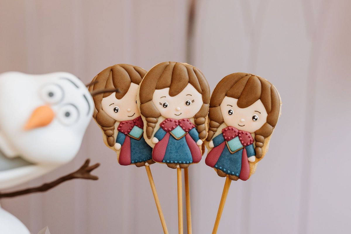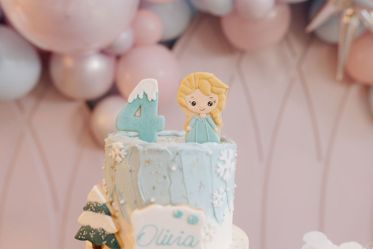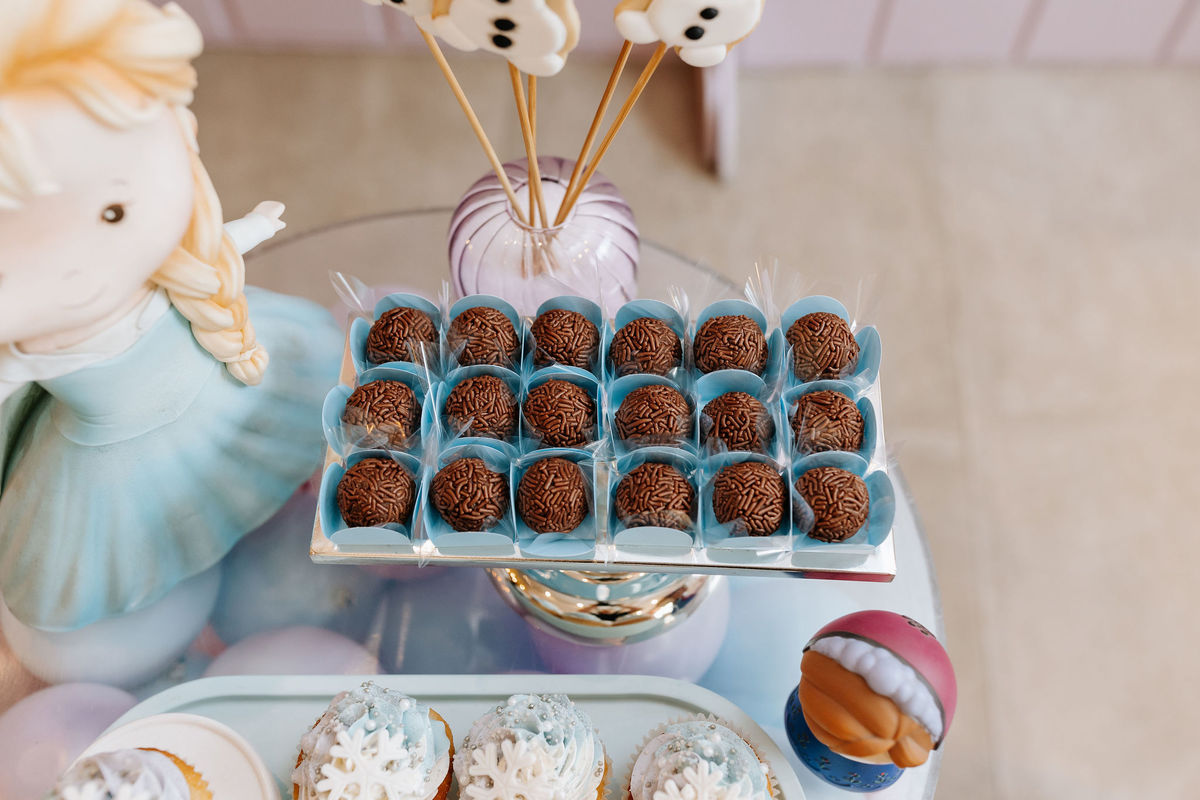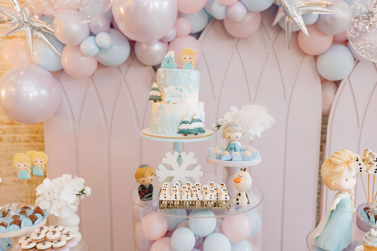 Mesa do bolo cuidadosamente montada. Referências à Elsa em cada canto. Um ambiente que parecia dizer, em silêncio: a Olivia ama Frozen, e nós amamos a Olivia.